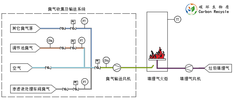 公司在武漢某垃圾填埋場對(duì)原有填埋氣火炬改造,目的是利用新火炬系統(tǒng)在燃燒填埋氣時(shí)燃燒產(chǎn)生的熱量,對(duì)于填埋場滲濾液處理設(shè)施產(chǎn)生的臭氣進(jìn)行熱氧化除臭。垃圾滲濾液調(diào)節(jié)池及垃圾滲濾液處理車間產(chǎn)生的臭氣集中收集后用管道通過風(fēng)機(jī)輸送至火炬配風(fēng)口混入火炬焚燒。在臭氣管道上設(shè)置氣體濃度分析儀、緊急切斷閥等安全保護(hù)裝置,保護(hù)裝置與輸送風(fēng)機(jī)、火炬連鎖控制。