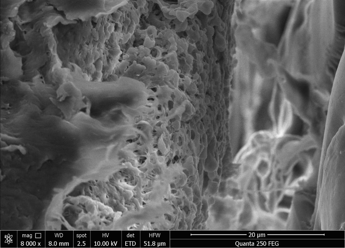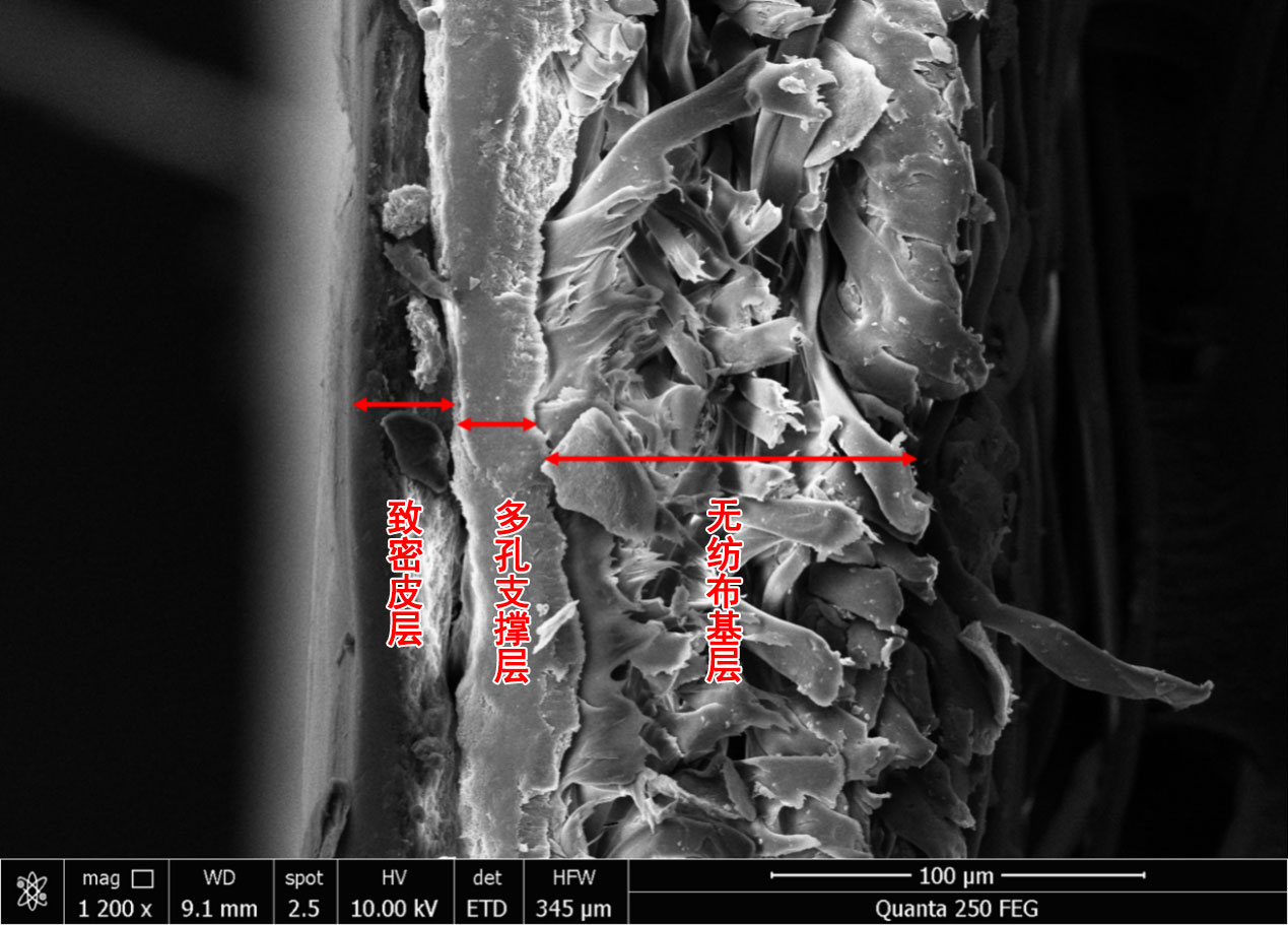 圖三 電鏡下氣體分離膜的三層結(jié)構(gòu)(照片由南京碳環(huán)生物質(zhì)能源有限公司提供)
