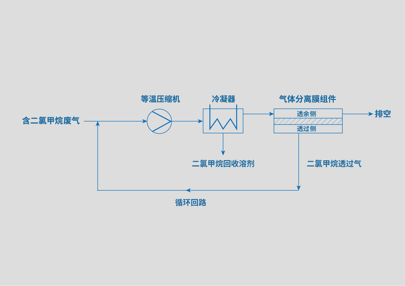 經(jīng)壓縮后的二氯甲烷有機(jī)廢氣進(jìn)入冷凝器,氣體中的一部分二氯甲烷被冷凝下來(lái),回收后的二氯甲烷溶液可以再次使用。而未冷凝的二氯甲烷氣體進(jìn)入氣體分離膜組件,在壓力差的推動(dòng)下,二氯甲烷透過(guò)膜,透余氣為脫除二氯甲烷后的氣體,通常為空氣。透過(guò)氣中富含二氯甲烷有機(jī)氣體,該氣體循環(huán)至壓縮機(jī)的進(jìn)口進(jìn)行復(fù)疊處理。由于二氯甲烷在循環(huán)回路中的濃度逐步上升,壓縮后進(jìn)入冷凝器的二氯甲烷達(dá)到凝結(jié)濃度,二氯甲烷又被冷凝下來(lái),成為可以被利用的液態(tài)二氯甲烷溶劑。