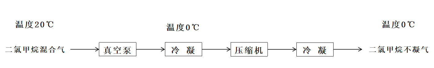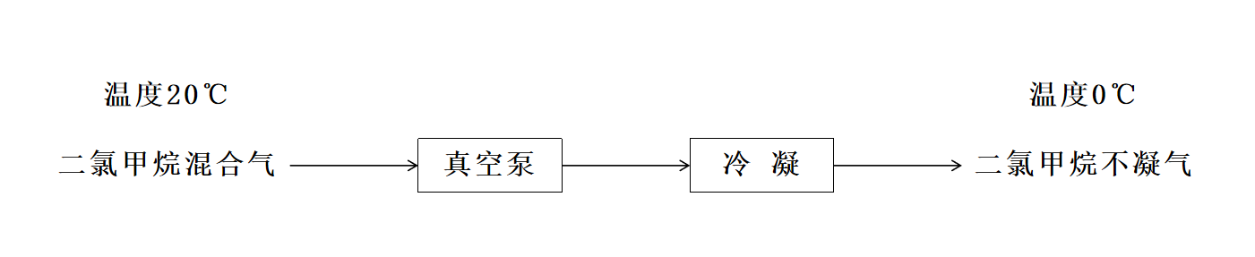 以二氯甲烷和空氣的混合氣為例:20℃時二氯甲烷的飽和蒸氣壓是47.39KPa,由公式(2)計算可知,此時二氯甲烷在混合氣中的含量約為46.8%。考慮到真空泵前后的氣體壓力變換不大,將該混合氣降到0℃。0℃時二氯甲烷的飽和蒸氣壓是19.2KPa,二氯甲烷在混合氣中的比例約為18.9%。由此可以看出,采用圖(1)所示的流程,將二氯甲烷和空氣的混合氣由20℃降為0℃,約有74%的二氯甲烷冷凝析出變?yōu)橐后w溶劑。但是仍有26%的二氯甲烷不凝氣體隨混合氣體進入后續(xù)廢氣處理裝置。