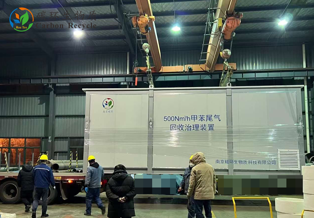南京碳環(huán)工作人員根據(jù)實地勘察項目現(xiàn)場,為客戶設計、制造了“甲苯尾氣回收治理裝置”。